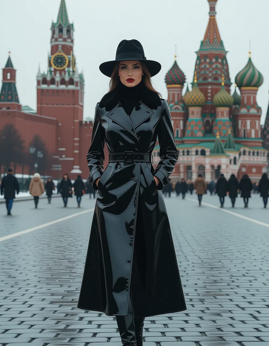 This image shows a woman in a latex coat and hat in Moscow's Red Square. The image blends futuristic and Soviet-era aesthetics, reminiscent of digital artwork.