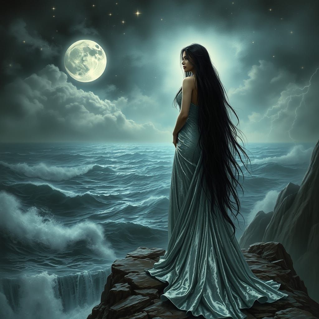 A captivating image of a gothic goddess with long black hair and a shimmering silver gown, standing on a cliff overlooking a sea of stars. The scene is rendered with rich, deep colors and detailed textures in a dark romantic style.