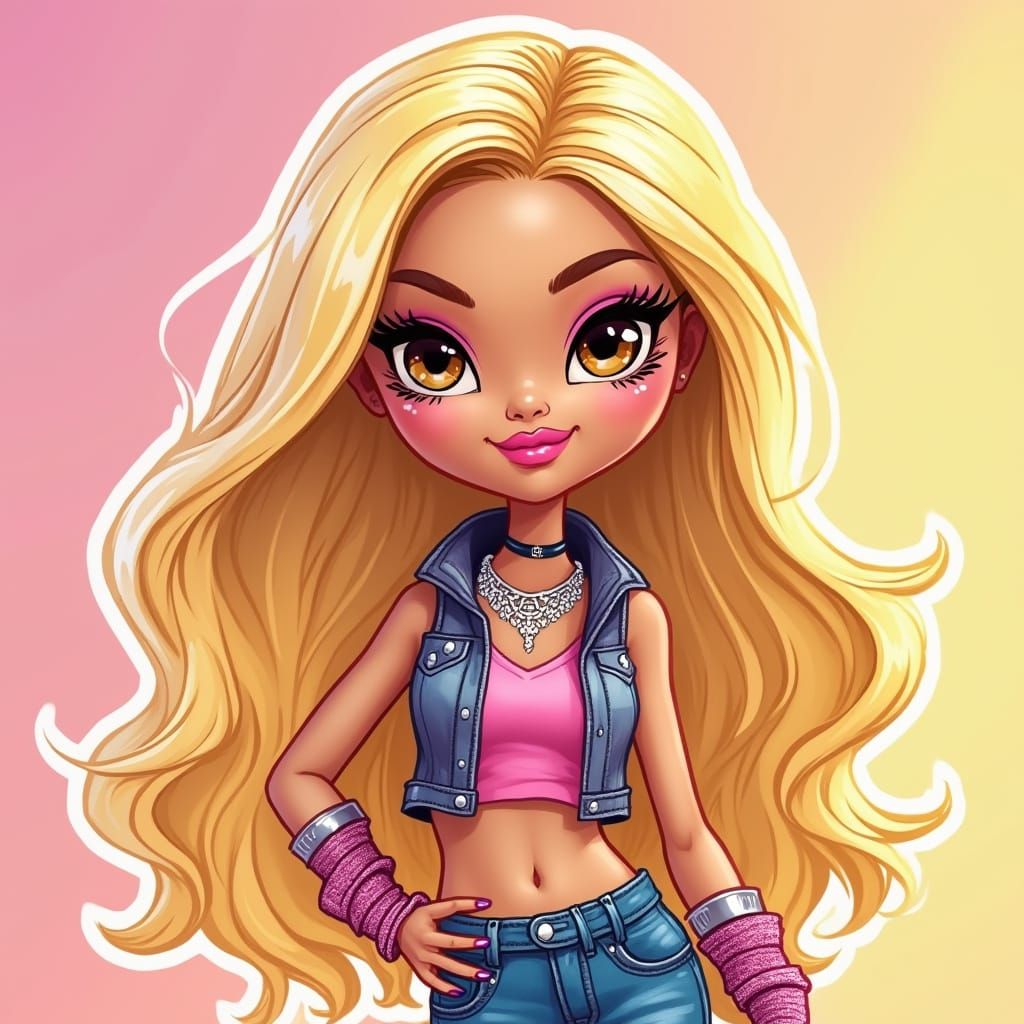 This image shows a Bratz-style doll with blonde hair and brown eyes, confidently posing in a trendy outfit. The doll is set against a bright pastel background, with bold graphic lines, as digital painting with cel-shading.