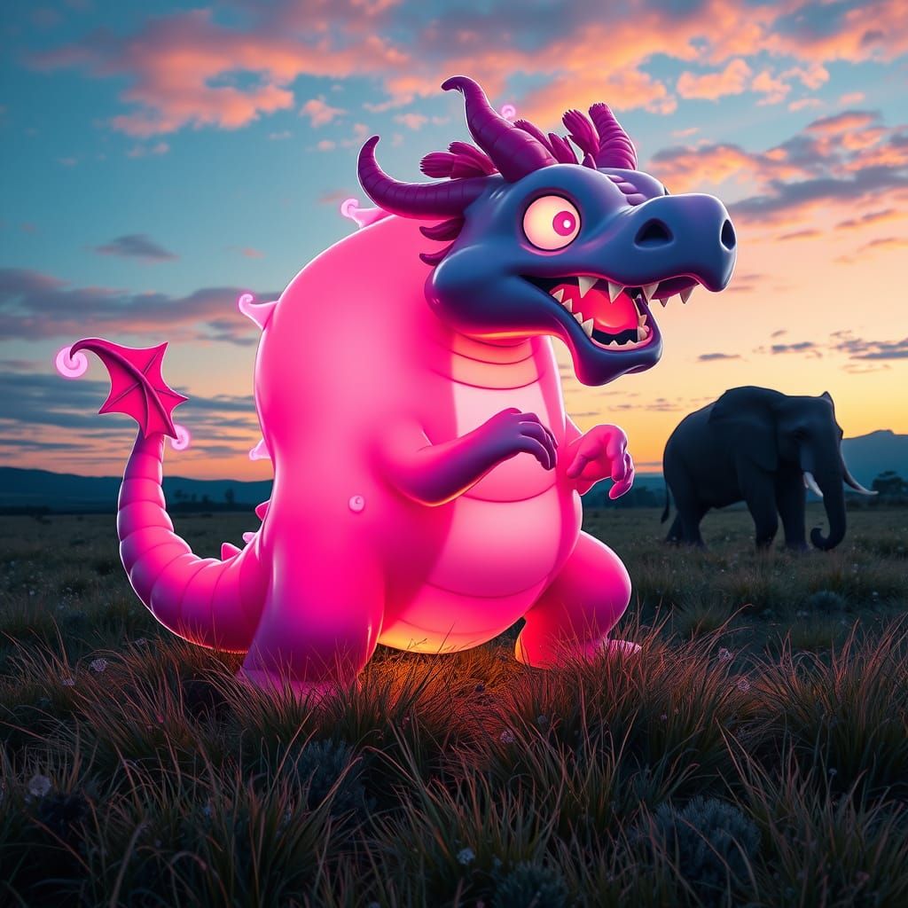 A surreal image of a dragon-like character delivering icy punches in a grassland setting. The scene features a prowling elephant, a glowing portal, and a vibrant, slime-inspired aesthetic reminiscent of 90s cartoons.