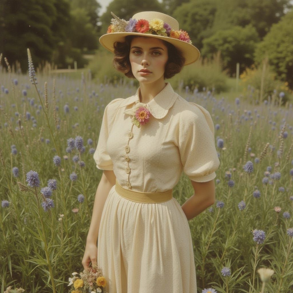 This image shows a young woman in a polka-dot dress and hat, standing in a sunlit garden holding flowers. The portrait captures a dreamy, nostalgic, and whimsical atmosphere with soft, warm light and muted tones.
