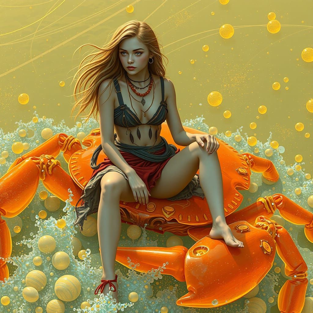 A striking picture of a young woman with golden hair, dressed in bohemian style, riding a large gummy crab through a fizzy sea. This digital art uses warm golden, amber, and bronze colors in a whimsical, neon aesthetic.