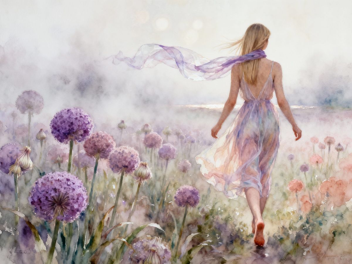 This image shows a woman in a flowing dress walking through a misty field of purple ornamental garlic under soft, diffused light. Created with impressionist strokes and mixed media techniques.