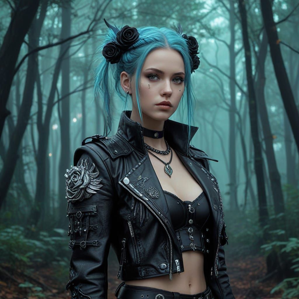 A gothic punk anime girl with glowing cyan eyes stands in a misty fantasy forest. She has monochrome rose and phoenix tattoos and wears black leather in a dark fantasy aesthetic.