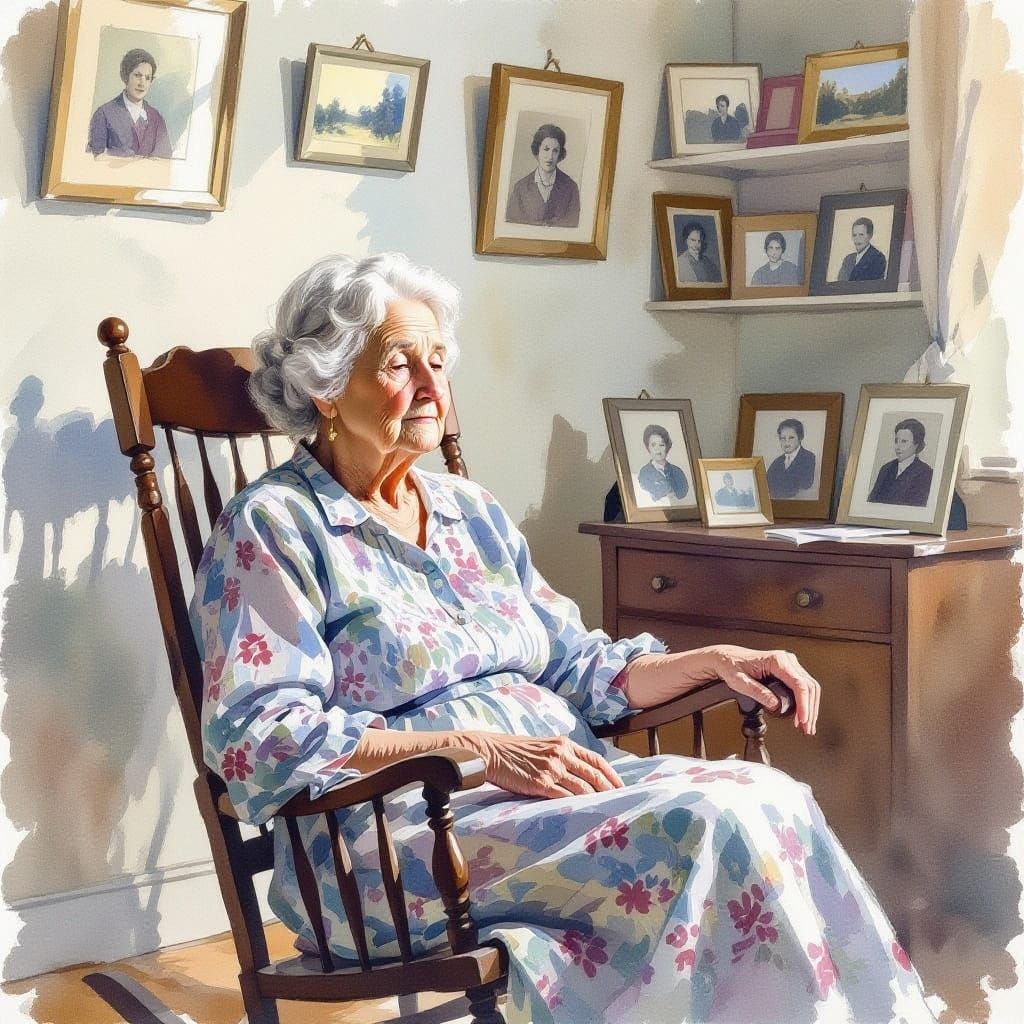A watercolor painting of a solemn elderly woman in a rocking chair, surrounded by framed family photographs. The artwork features visible brushstrokes and soft, warm colors, reminiscent of classic impressionist styles.
