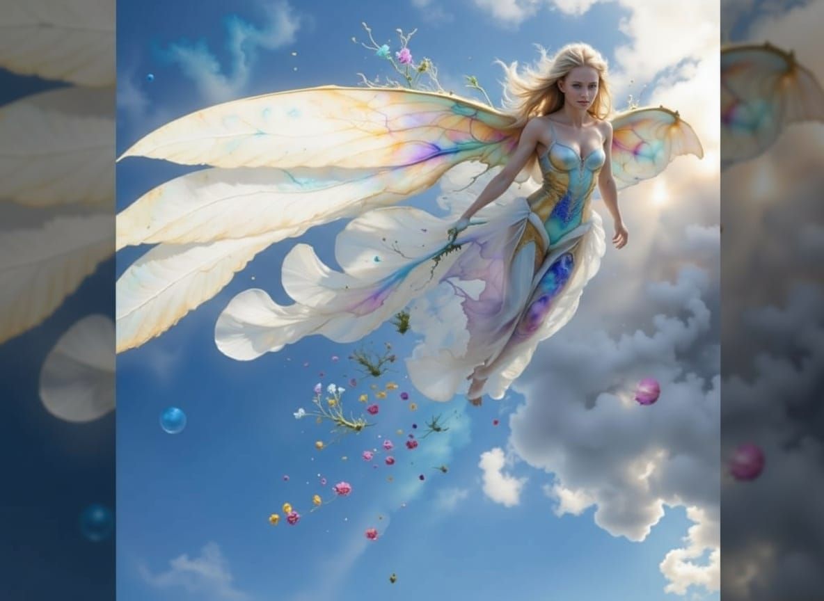 This image shows a modern mythical fairy with wide wings catching the sunlight as she flies upwards, dropping blooms. Surreal and detailed, the image captures the end of summer.