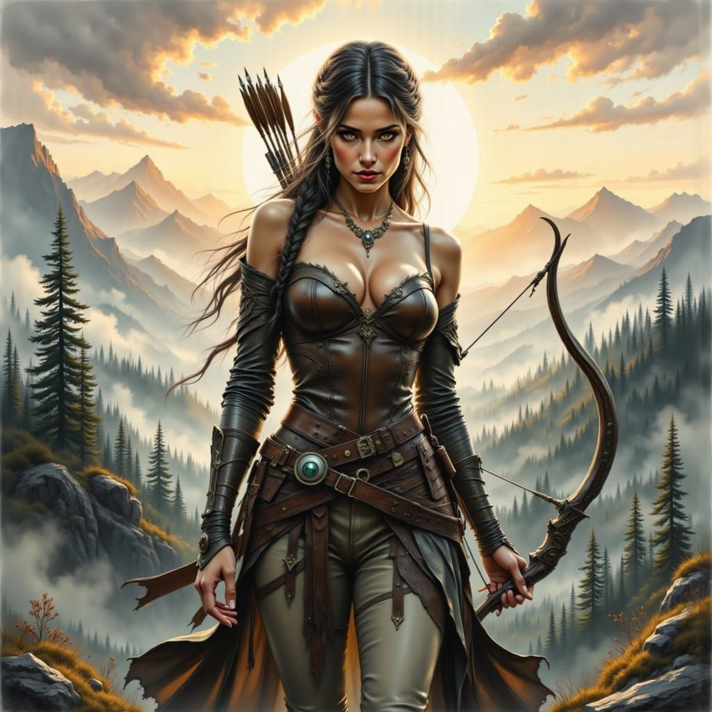 This image shows a strong woman with braided hair, dressed in leather armor, standing on a hilltop overlooking a forest. She is carrying a bow and arrows in this hyperrealistic fantasy artwork.