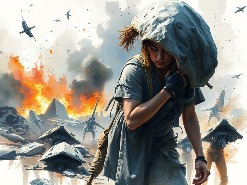 A dramatic watercolour painting of a survivor hiding amidst an alien invasion. The expressive piece captures dramatic lighting, expressive brushstrokes and cinematic flair in a stylized scene.