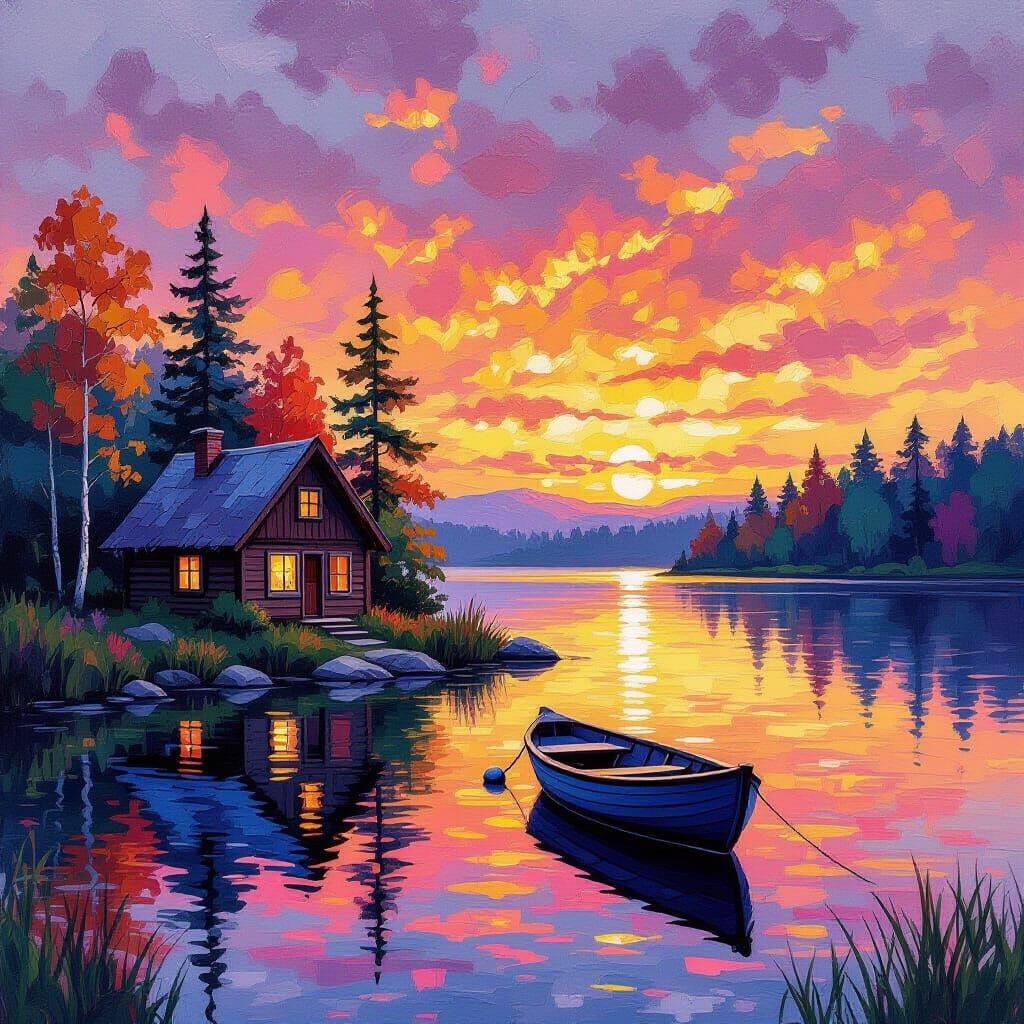 This image shows a cozy cabin beside a serene lake with a solitary boat. The sky features a breathtaking sunset with intense orange, pink, and purple hues, rendered in a thick, impasto gouache watercolor style with heavily textured brushstrokes.