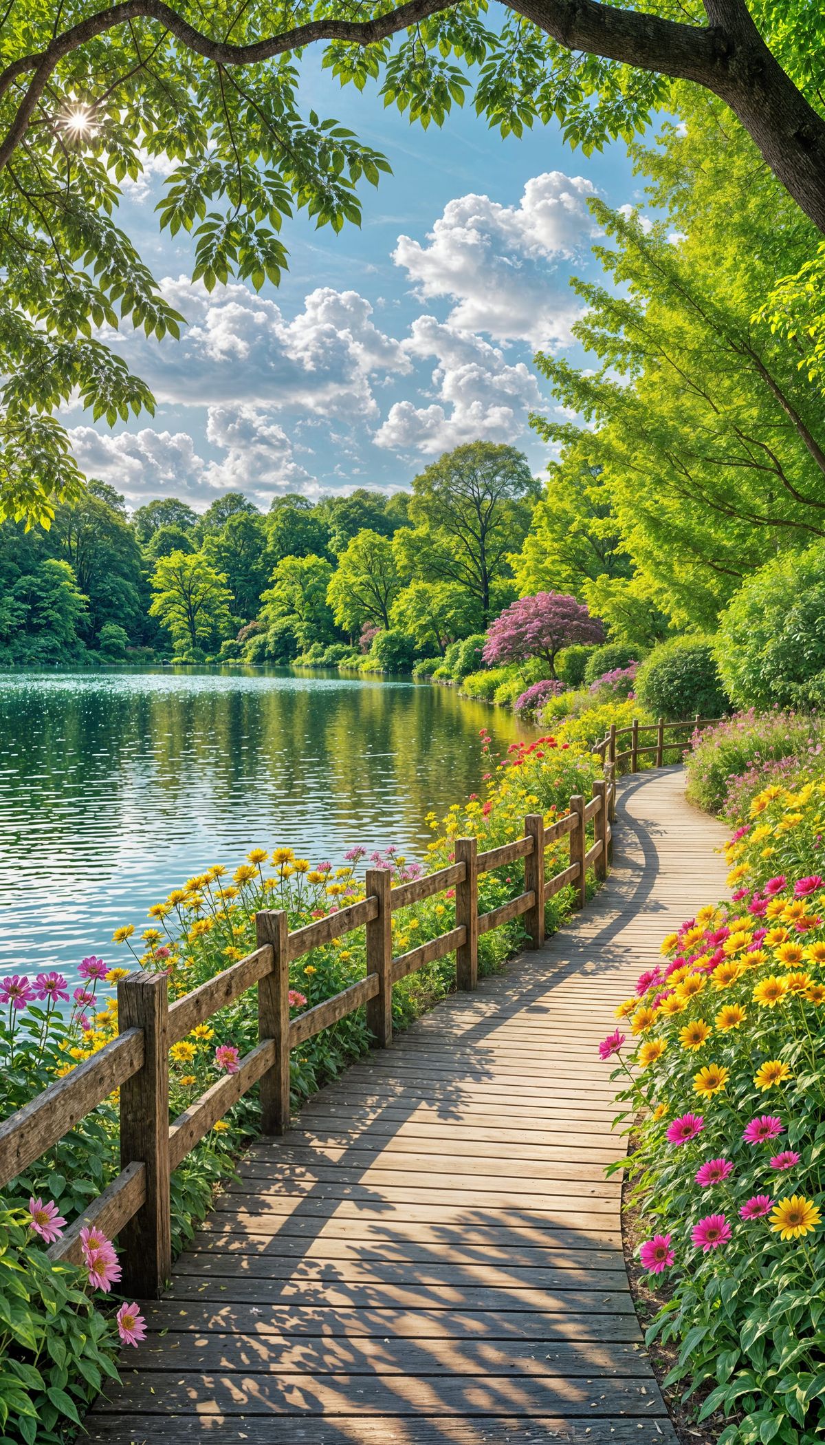 This image shows a serene garden bursting with colorful flowers next to a clear lake. A wooden fence lines a scenic path under sun-dappled trees, creating a peaceful natural scene.