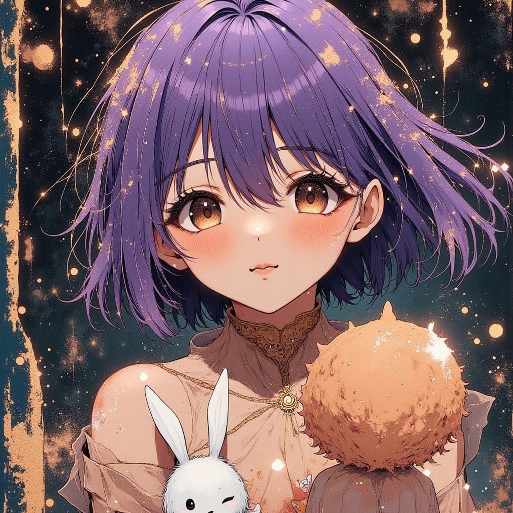 80s anime, a beautiful young slender Japanese determined girl with distinct shoulder-length purple hair, often worn with a headband or tied ...