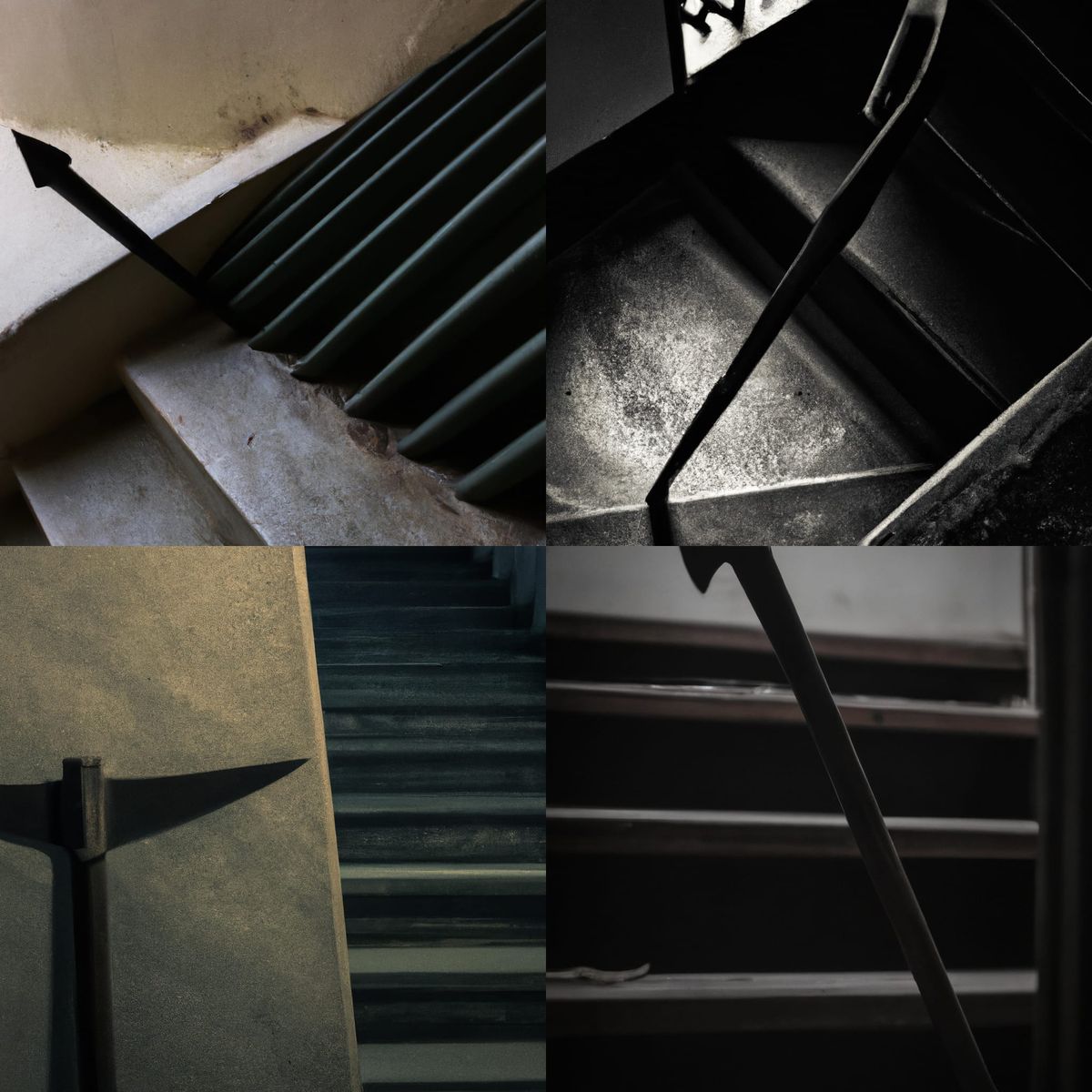 This image shows a crowbar lying on a flight of dark stairs. The stark lighting enhances the contrast between the tool and the dimly lit steps.