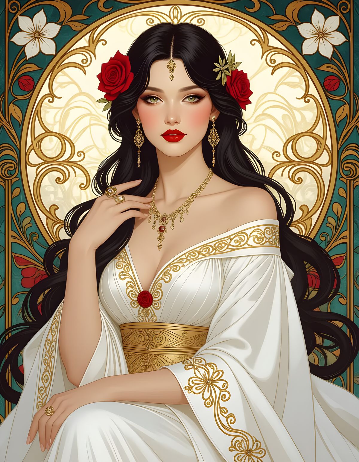 A beautiful woman with dark hair and red rose adornments. This image shows the subject wearing flowing white attire with gold embroidery against an abstract floral background, in a fantasy style reminiscent of art nouveau.