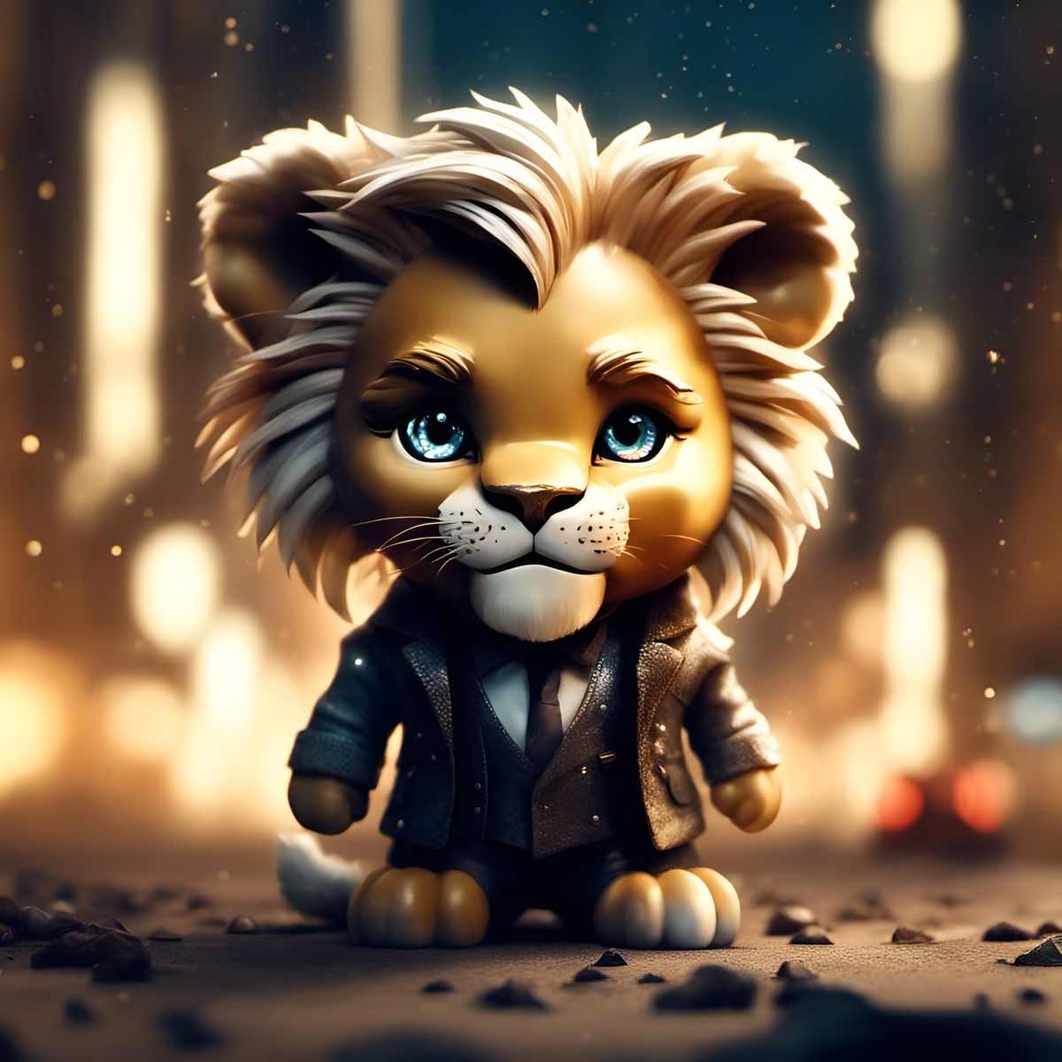 A 3D rendered image of an adorable chibi lion dressed as Leonardo DiCaprio. The image features intricate details, soft fluffy fur, and dramatic lighting in a maximalist style.