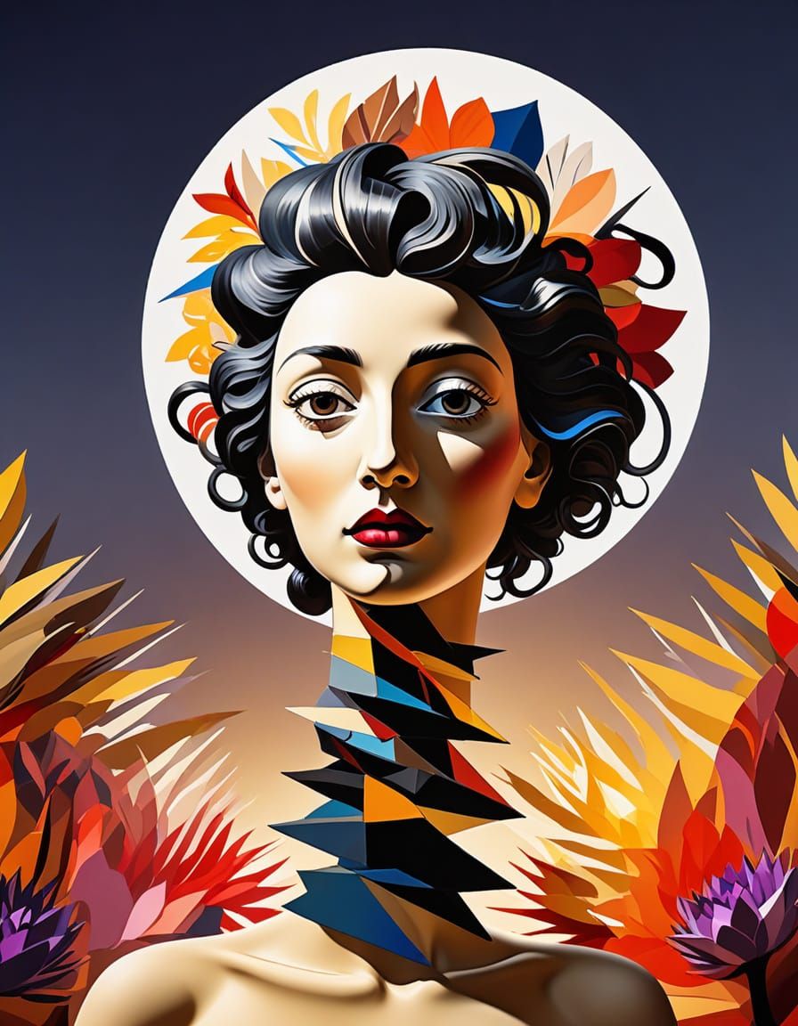 This image shows a close-up of a vibrant, multicoloured dreamscape featuring intertwined flowers and a porcupine, set against a backdrop of bold, graphic shadows and warm, golden light, blending Cubist and Surrealist styles with Impressionist brushstrokes.