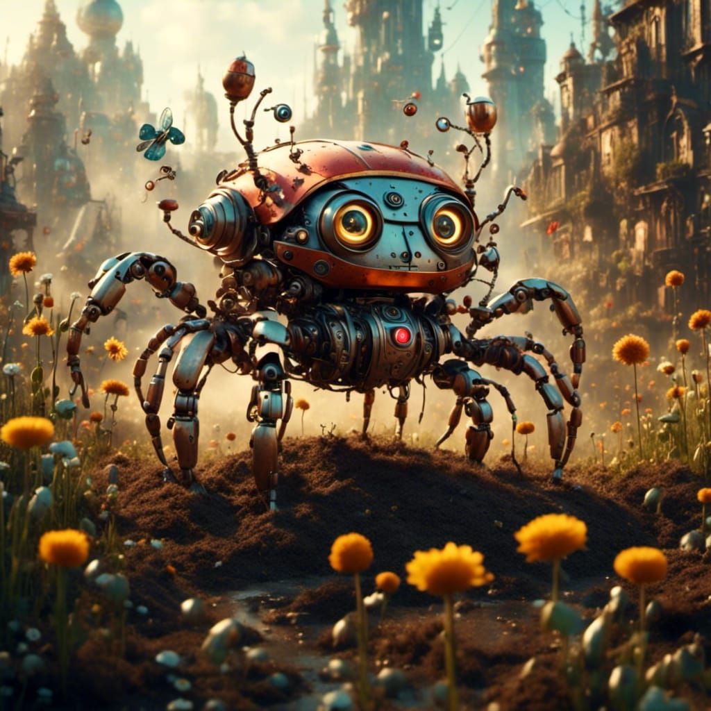 This image shows a fluffy robot crab tending a garden amidst ruined buildings. The scene features dynamic lighting, rain, and a mix of flowers and weeds in a steampunk aesthetic.