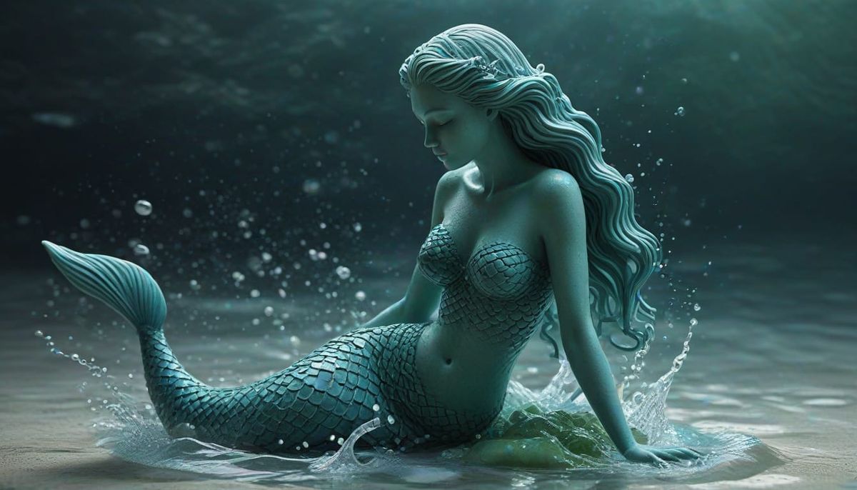 This concept art features a mermaid sculpture crafted from opalescent sea glass, rising from a fountain of ocean water. Rendered with realistic illustration and ethereal lighting, showcasing intricate detail.