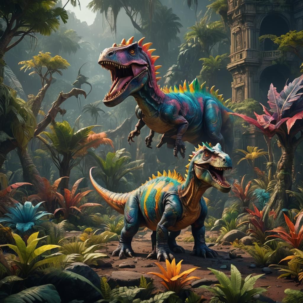 This image shows a vibrant multicolored dinosaur. The digital painting features deep colors and intricate details, creating a fantastical and complementary color scheme in 8k resolution.
