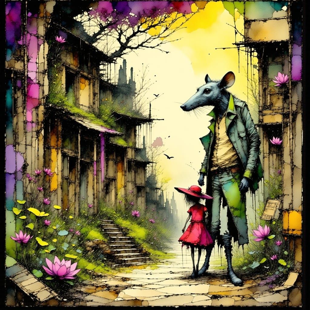 A grizzled rat detective in a trench coat meets a woman in red amidst ruined city overgrown with vines. This comic book style image features bold lines and stark contrasts.
