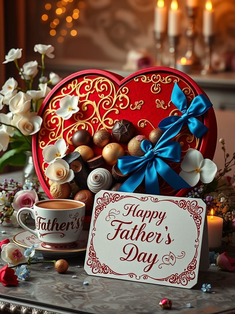 This stunning 3D-rendered still life features a luxurious, heart-shaped box adorned with intricate gold filigree swirls, overflowing with decadent chocolates, surrounded by white roses, orchids, and wildflowers, with a beautifully lit porcelain cup and fairy lights in the background, creating a warm, ele...