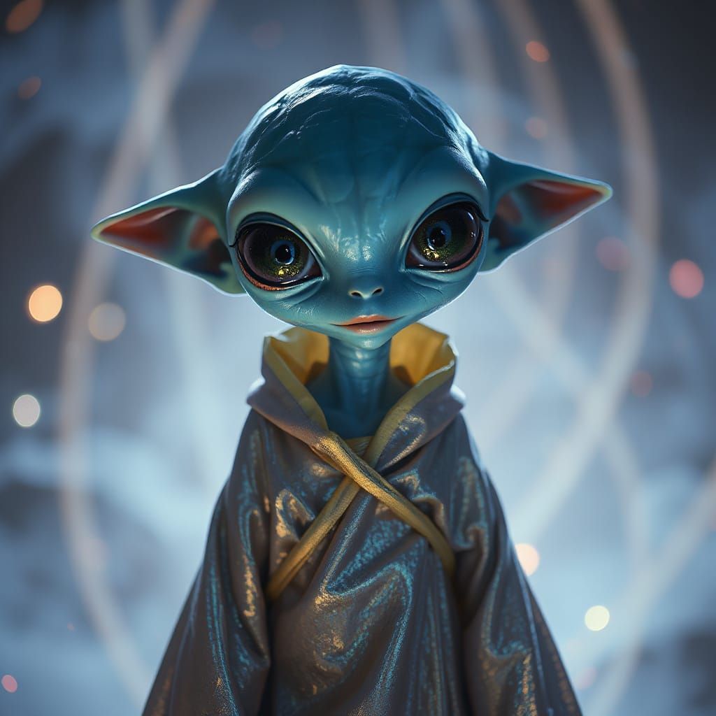 This image shows a blue alien with large eyes, clad in an iridescent robe, enveloped by a soft, ethereal glow. The otherworldly aesthetic is reminiscent of science fiction concept art.