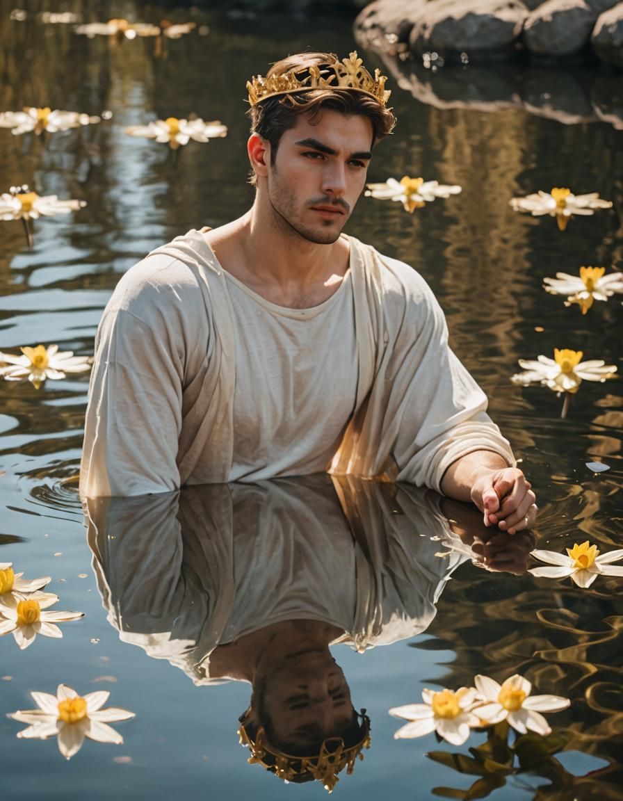 This image shows a classically handsome Greek god gazing at his reflection in the water. The figure is adorned with golden accessories and white flowers in a detailed digital painting.