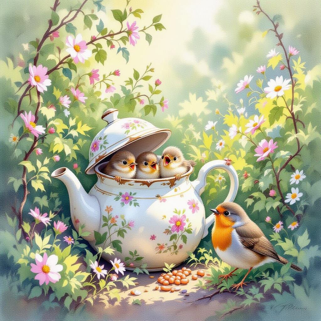 woodland flowers, vines, bushes surround an old chipped teapot. It is balanced in the shrubbery so that the spout is closest to the ground. There are three baby birds, inside the open teapot, shouting for their food. Stood close to them ...