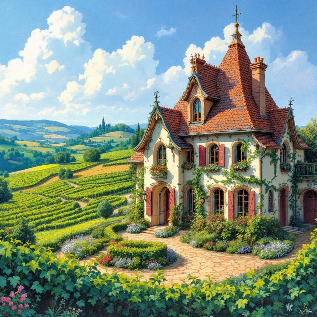 This image shows a beautiful, intricately detailed French house with a vibrant, ornate roof, set amidst a serene, rolling landscape with lush grapevines, in a post-impressionist style reminiscent of Van Gogh's vivid colours and expressive brushstrokes.