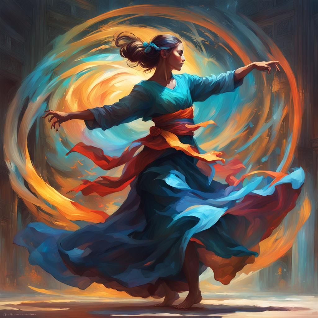 A portrait of a figure dancing in light and shadow. The image features dynamic lighting, intricate details, and a vibrant color palette in the style of digital art.