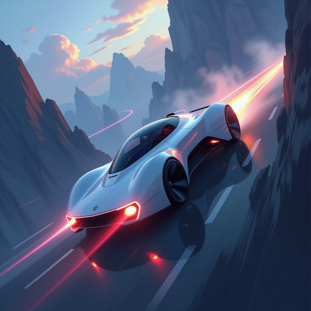 This image depicts a fantastical flying machine gaining speed as it slides down a steep cliff. Rendered with vibrant colors and deep shadows in a futuristic concept art style.