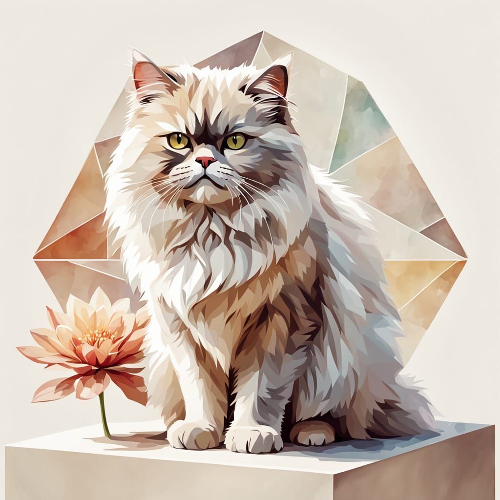 A geometric watercolor image of a Persian cat standing on a beige platform with a flower. The artwork features faceted shapes and angular polygons with soft, white steam.