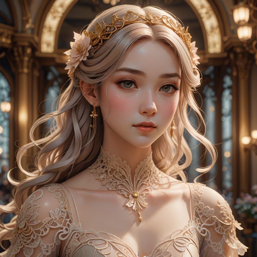 This image shows a close-up portrait of a girl in a ballet pose rendered as anime-inspired 3D art. The image features intricate lace details, soft flowing hair, and a warm, golden lighting in an Art Nouveau style.