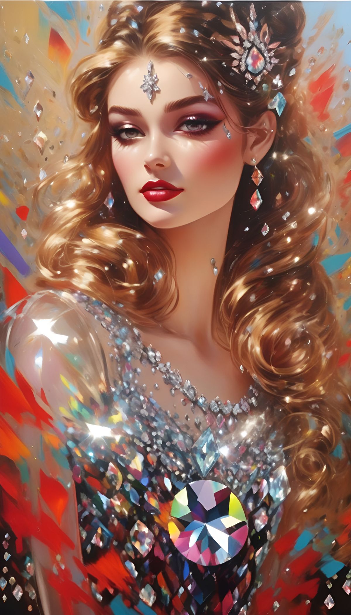 A striking picture of a ballerina with a mechanical eye, adorned with bold jewelry. This maximalist portrait features dynamic threads and a rich color palette, resembling a detailed, high-resolution art print.