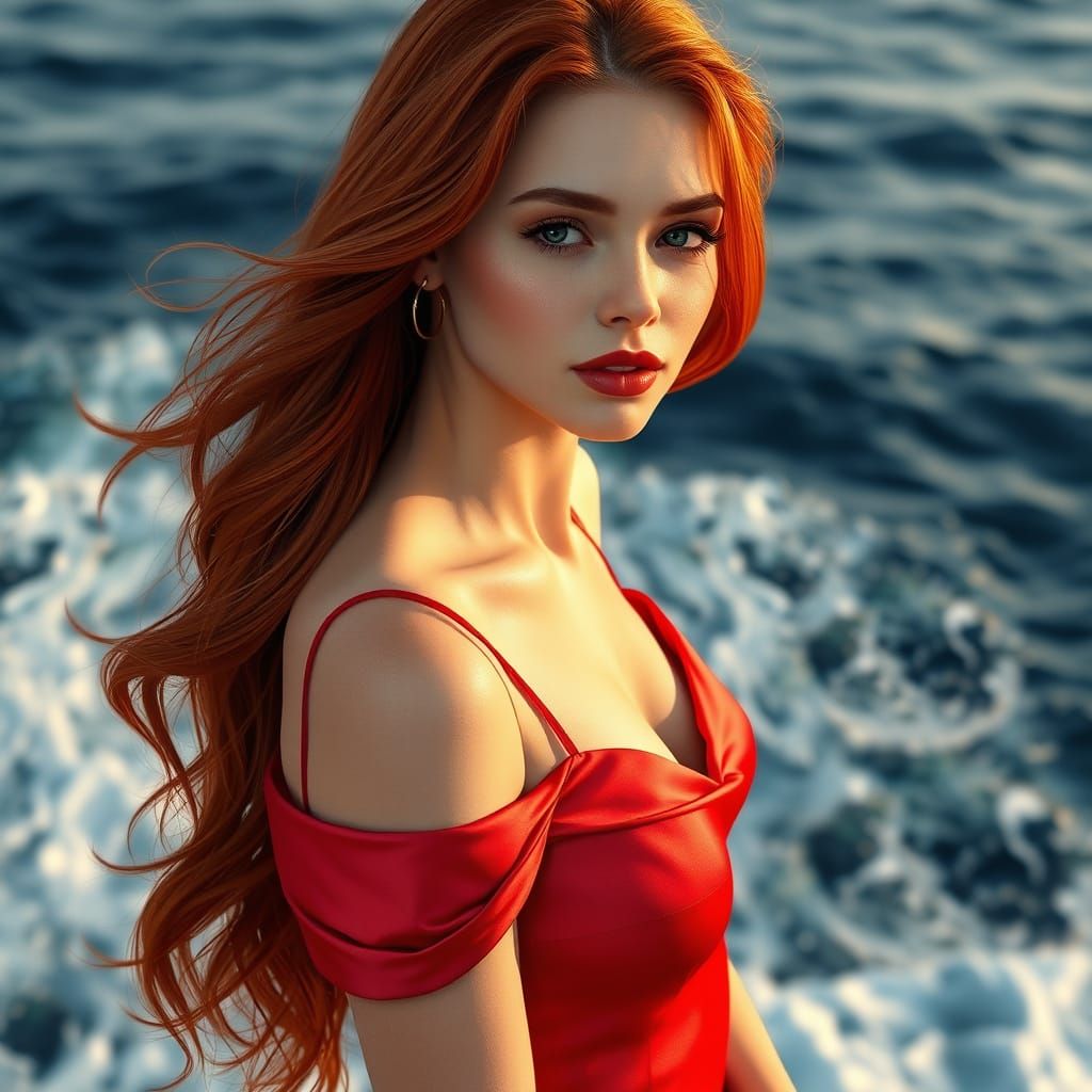 This image captures a stunning redhead in a fitted strawberry red mini dress, set against a breathtaking seascape of frothy white waves and deep blue ocean, blending photorealistic quality with high-end fashion flair.