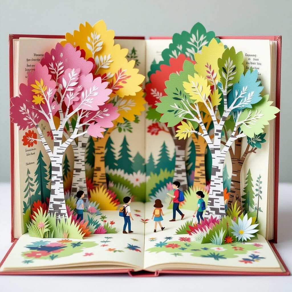 This image captures a whimsical forest scene designed like an intricate pop-up book. Paper trees and landscapes made from crumpled pages create a playful, vibrant world.