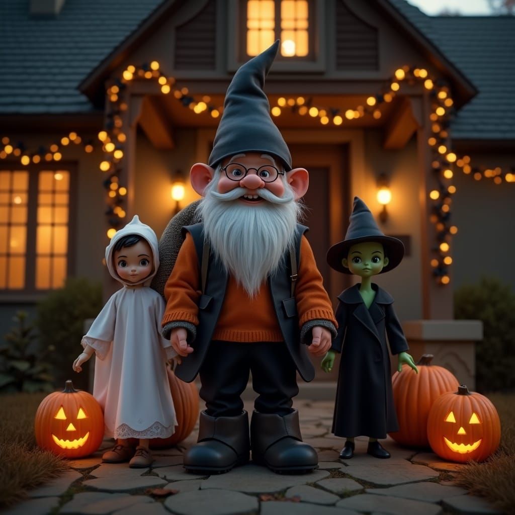 This hyperrealistic image shows a gnome and three children dressed for Halloween on a cottage doorstep, holding candy sacks. Warm, eerie lighting from jack-o'-lanterns illuminates the scene.
