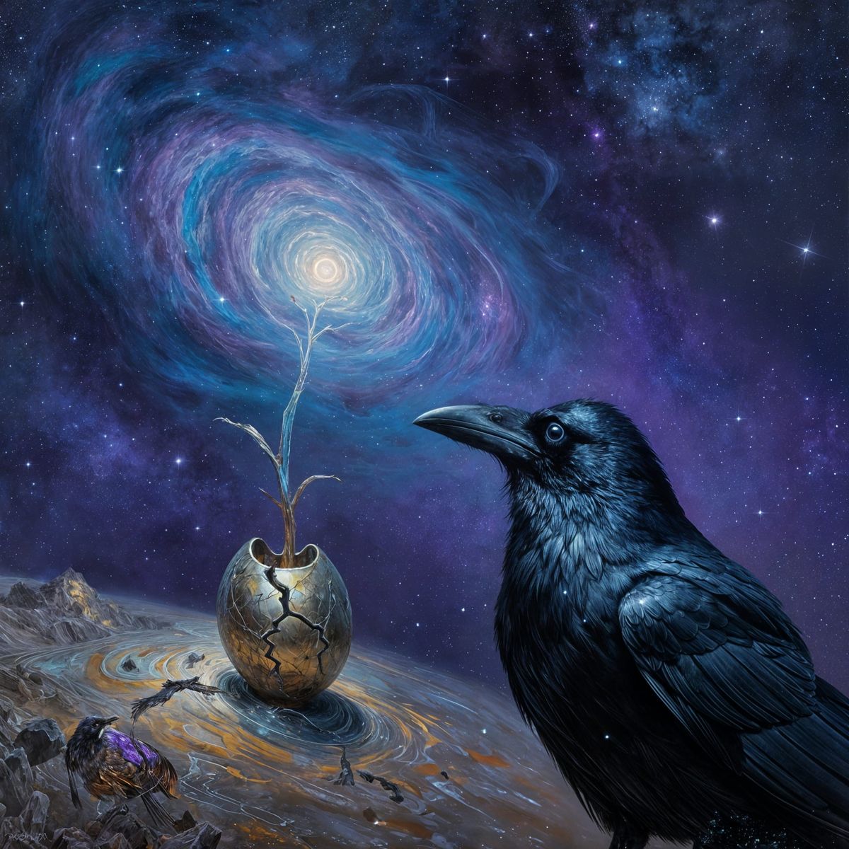 This image shows a solitary raven on an alien world, looking towards a glowing cosmic cloud. A metallic seed sprouts new life, symbolizing hope against a backdrop of purple and blue stars, rendered with oil on canvas texture.