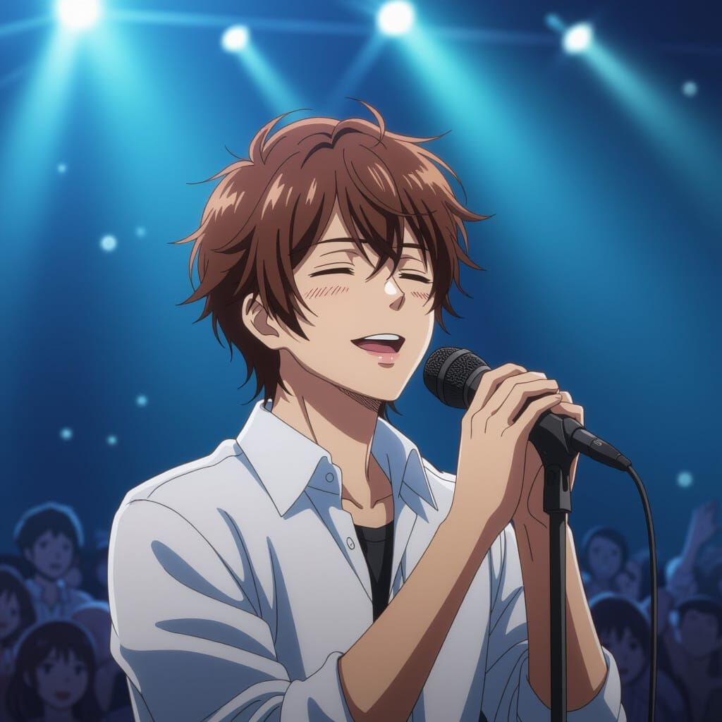 Suggested prompt: A majestic anime-style singer performing on a grand, ethereal stage, bathed in atmospheric spotlights. The singer has brown hair and freckle...