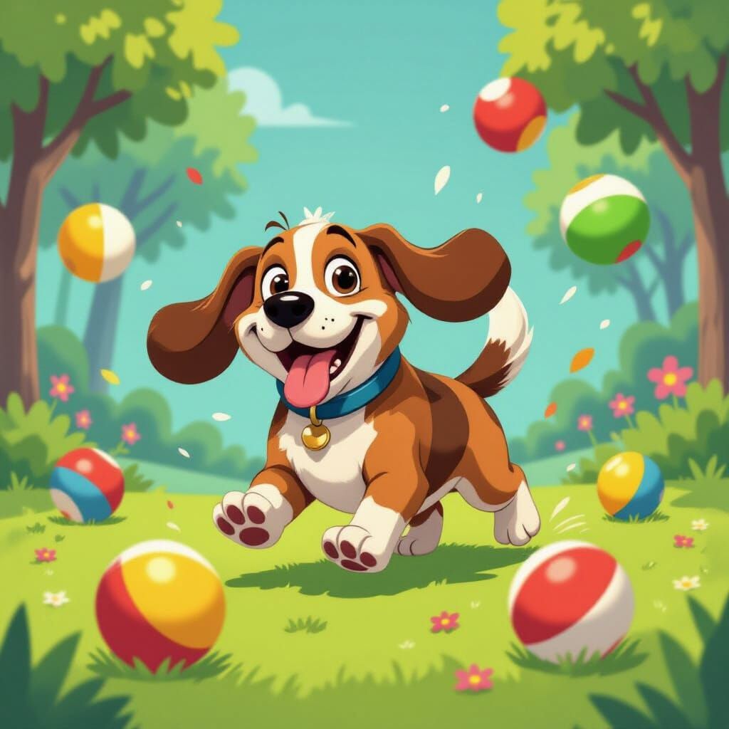 This image shows a cute Basset Hound enthusiastically chasing oversized, colorful bouncing balls. The scene is depicted in a lively cartoon style with bold outlines and vibrant colors, capturing a funny and energetic moment.