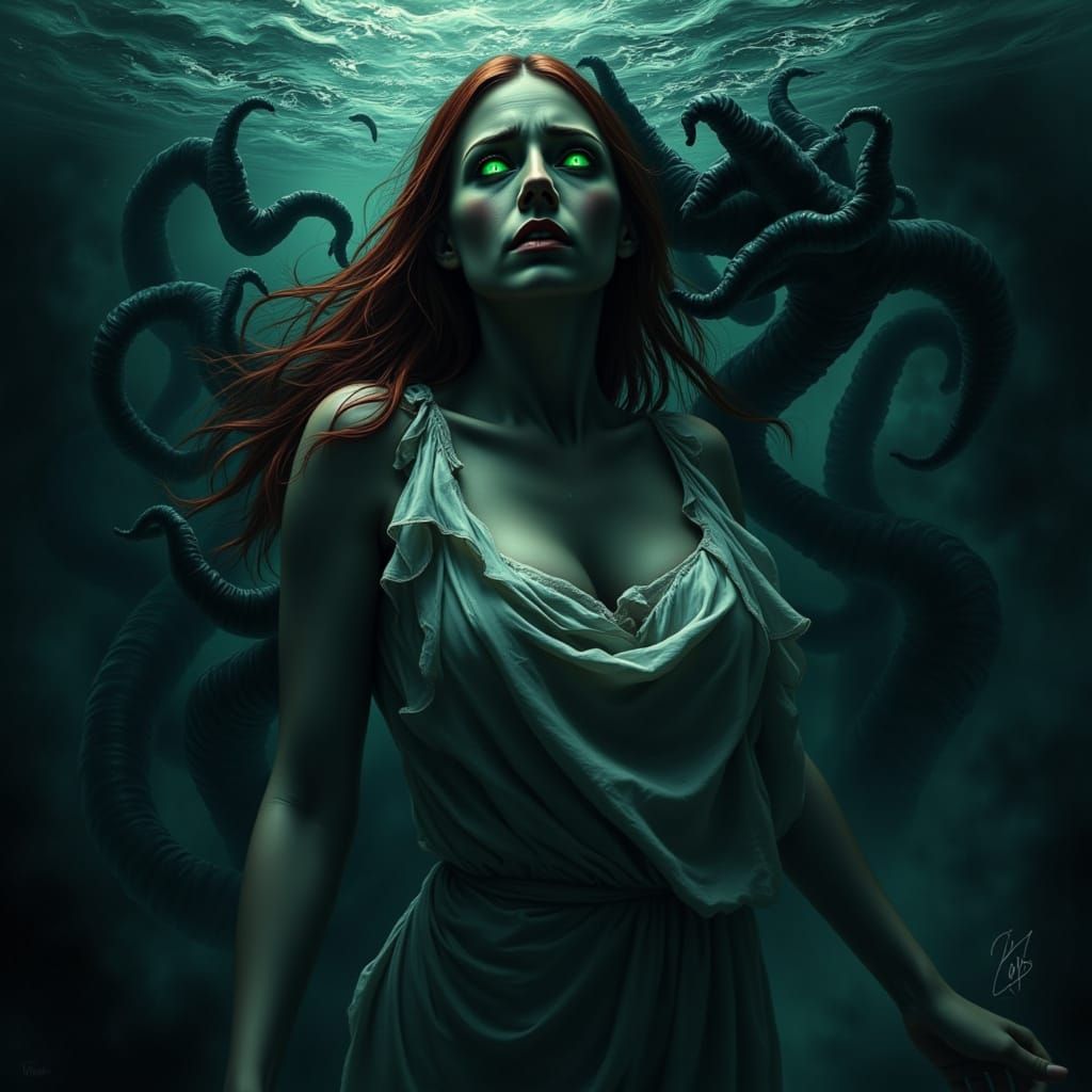 This haunting image depicts a woman being dragged down into dark, murky waters by a seductive, evil siren. The scene is set amidst an aura of ominous energy, with deep, rich colors and intricate details evoking a sense of foreboding and dread, blending elements of dark fantasy and surreal landscapes.