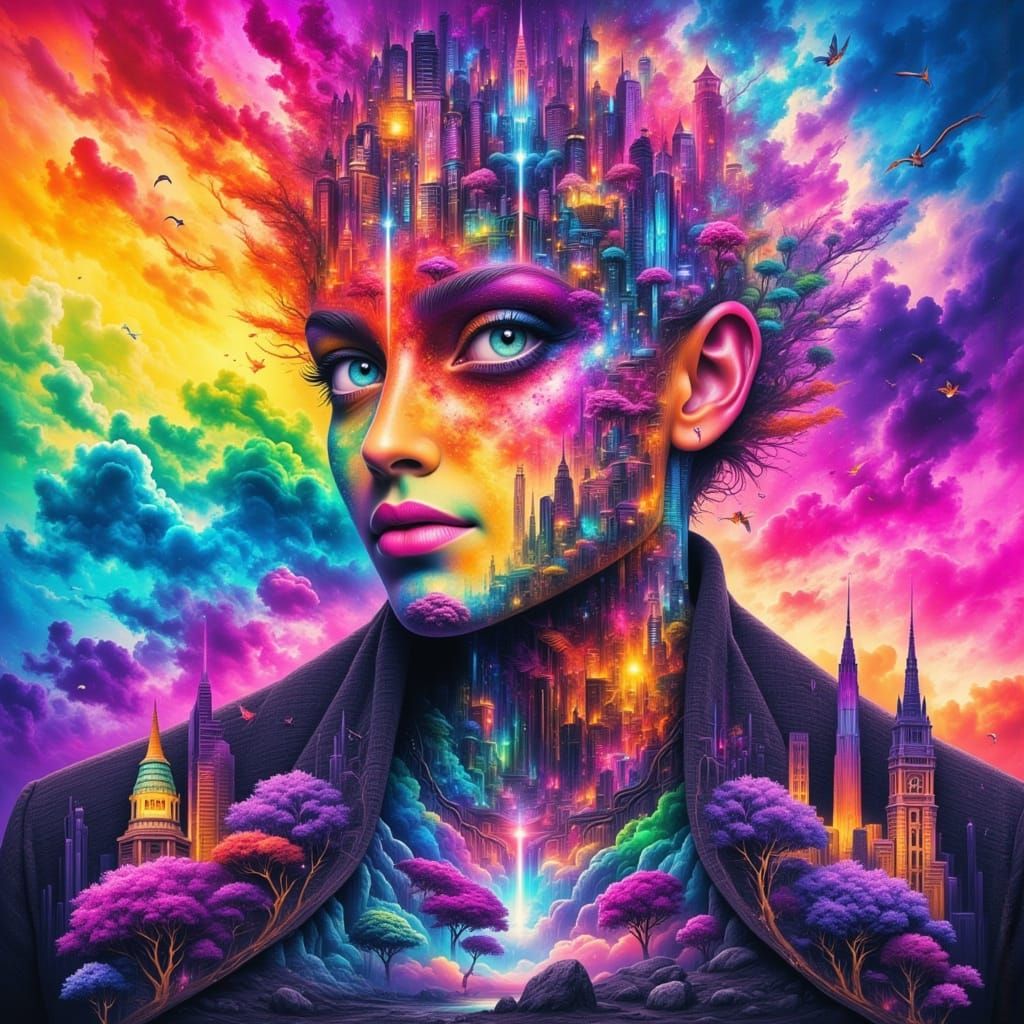 This image shows a vibrant rainbow flag symbolizing LGBTQ+ pride. The image is a surreal abstract with vivid colors, and explores themes of identity and diversity.