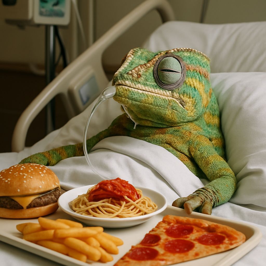This image shows a photorealistic chameleon in a hospital bed, eyes closed and seemingly in a food coma. The humorous and satirical image is rich with accurate details.