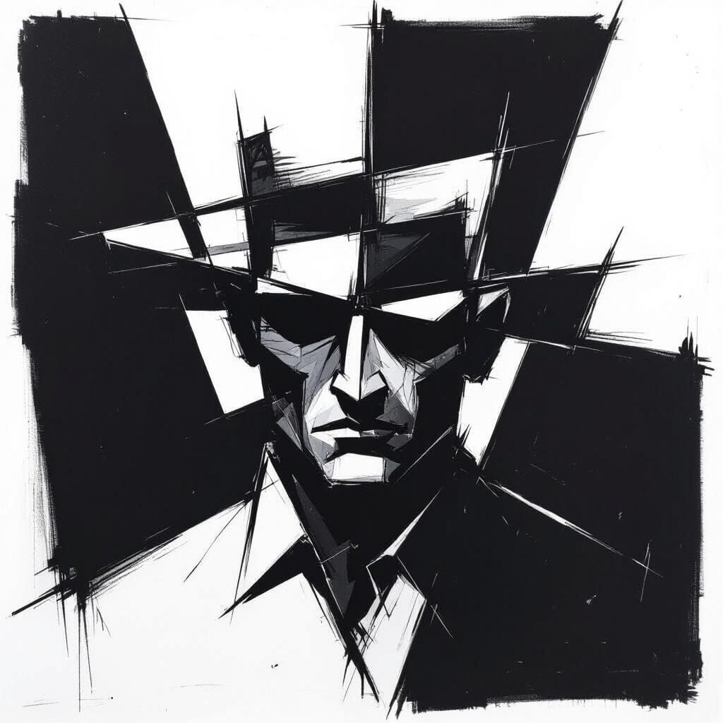 This image depicts overwhelming psychological terror through stark, overlapping black lines on a white background, evoking a claustrophobic noir aesthetic with deep shadows and harsh light.