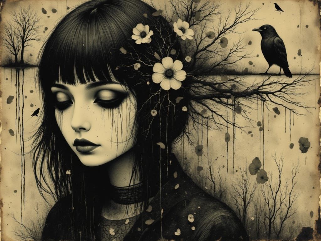 This image depicts a delicate young Gothic woman in a surreal, rain-soaked landscape. Textures of petals and parchment blend with a cold, saturated palette, evoking a dreamlike, melancholic atmosphere.