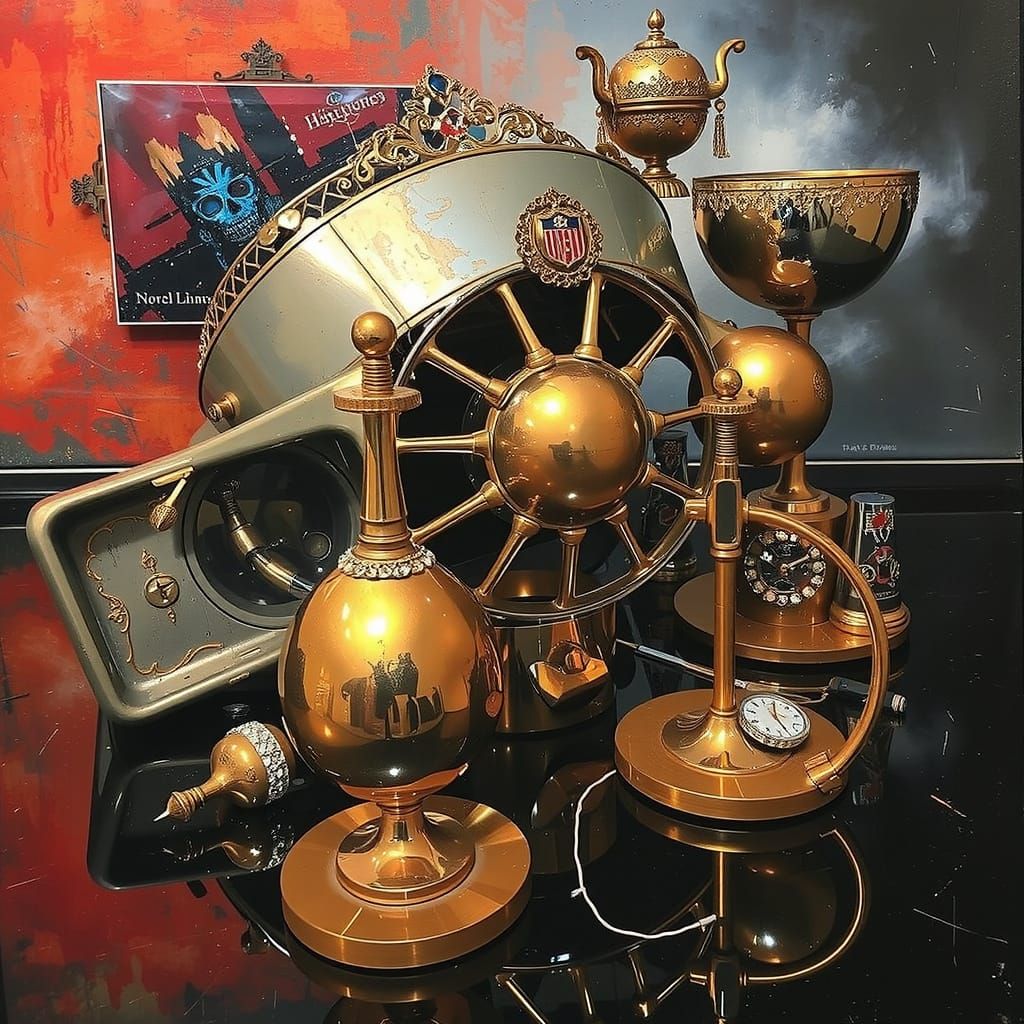 This image showcases an array of metallic surfaces with gold, silver, brass, and chrome textures. The polished surfaces glint with light and reflections, creating a shiny, burnished effect.