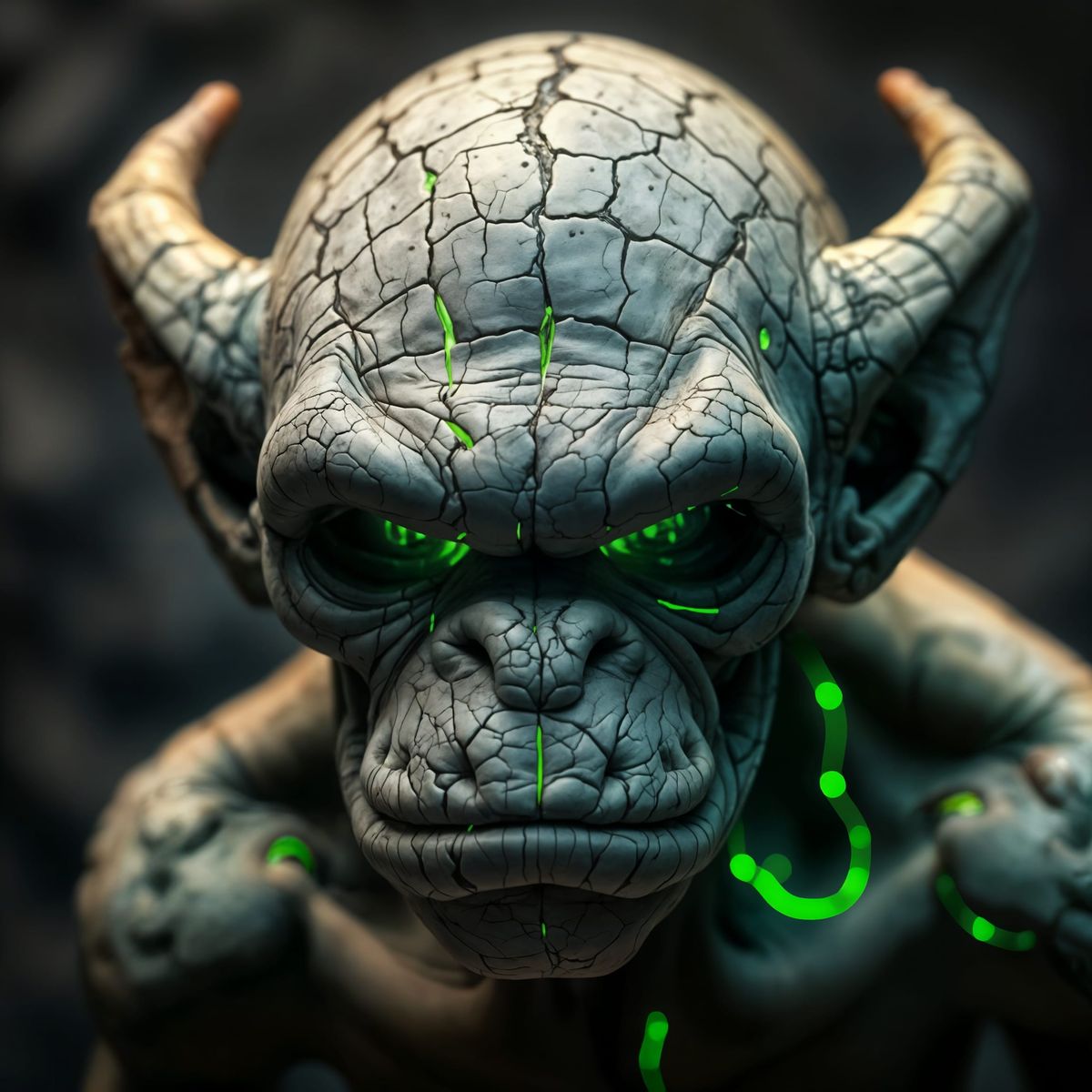 A hyperrealistic portrait of a troll with marble-like skin and neon green veins. The dramatic lighting and textures create an ethereal atmosphere, symbolizing pain and liberation in a fine art photography style.