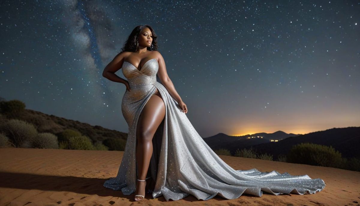 This image shows an ebony woman in a shimmering silver gown under a starlit sky. The woman has a voluptuous, curvy figure.