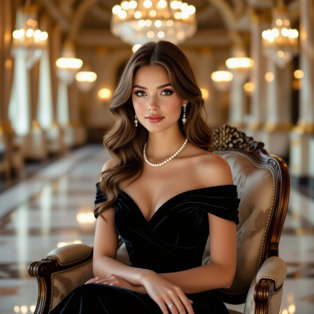 A portrait of a woman in a velvet dress and pearl necklace, seated in a grand ballroom. The image evokes a sense of timeless elegance and romanticism, reminiscent of art nouveau.