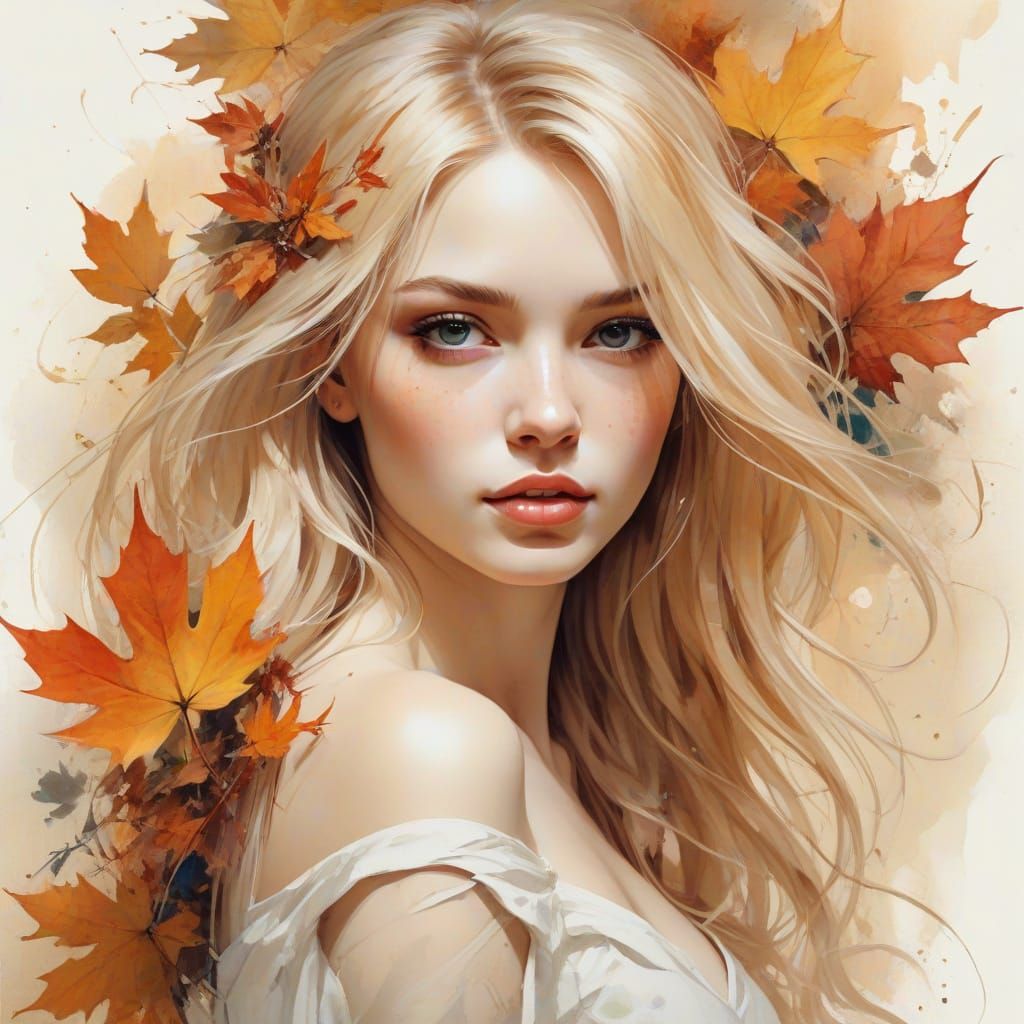 This expressive watercolor painting captures a beautiful autumn woman with flowing hair, rendered with abstract shapes and soft curves. Features dramatic lighting and gorgeous colors.