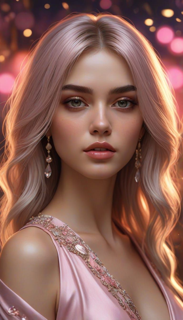A vivid portrait of a young woman with flowing hair before a backdrop of fireworks and gems. The image is reminiscent of an oil painting, featuring triadic colors and dynamic lighting.